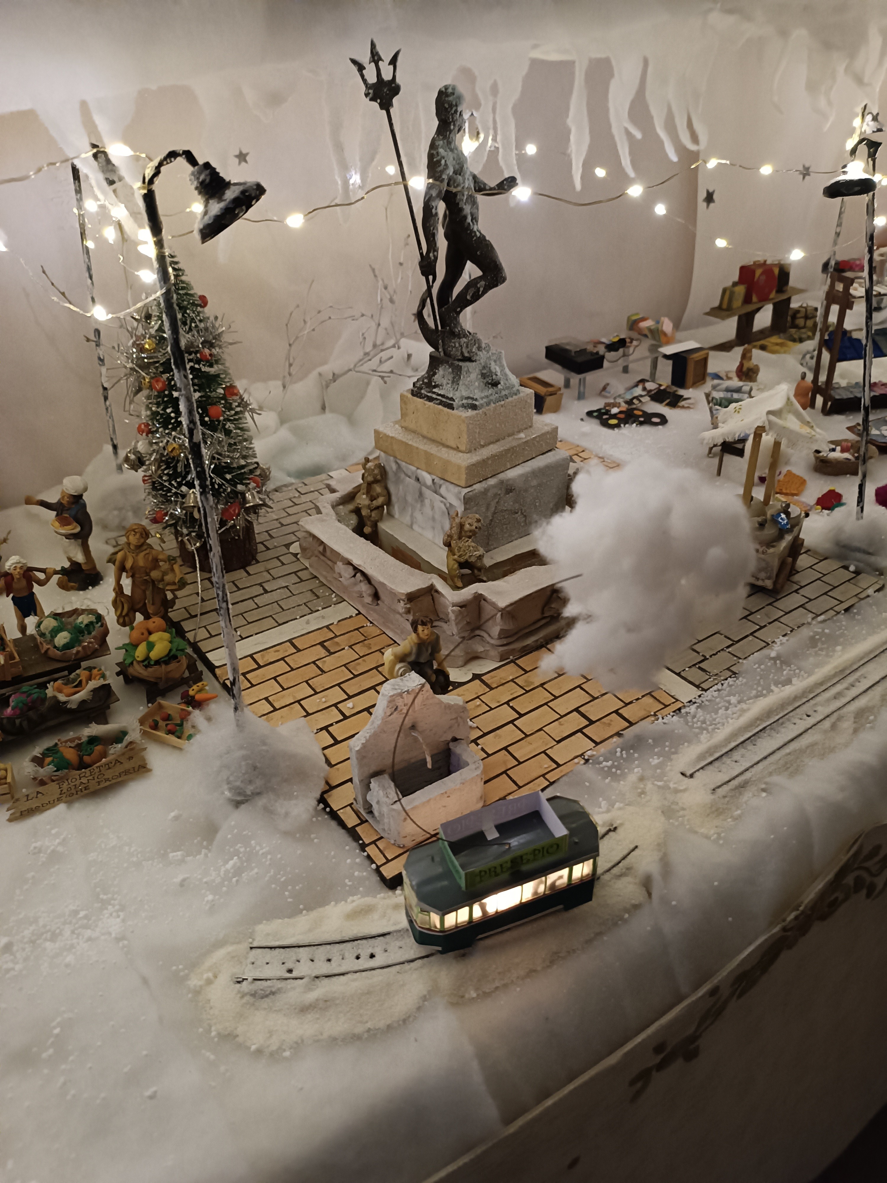 New this year: the large Nativity Scene evolves following the transformation of the city. There is the new tram in construction)