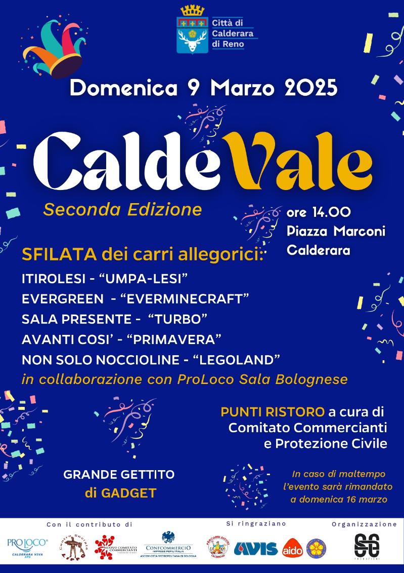 On Sunday 1 March 2026 from 2:00 pm, Piazza Marconi in Calderara di Reno hosts CaldeVale, the Carnival celebration featuring a parade of allegorical floats, a gadget throw and a refreshment area (curated by the Traders’ Committee and Civil Protection).