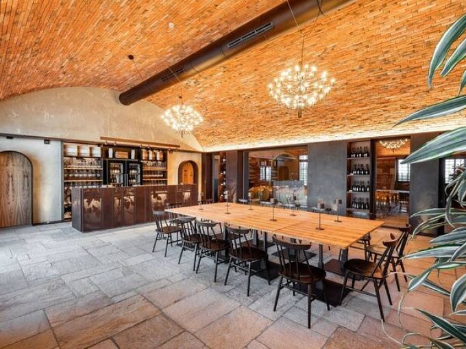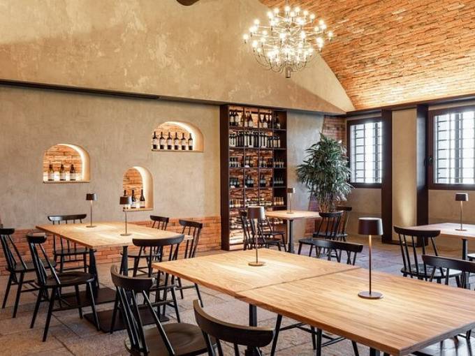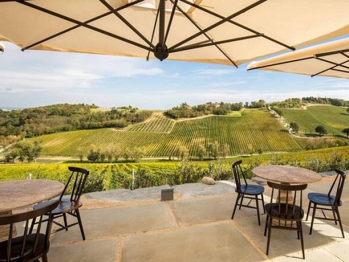 Eleganti finiture di design e colori che ricordano il foliage autunnale caratterizzano la sala degustazione, dove la vista si perde verso la terrazza affacciata sulla spettacolare vigna attualmente in fase di conversione a biologico, ove, accanto ai vitigni autoctoni, quali Sangiovese, Albana, Famoso, Malbo Gentile e Pignoletto, si coltivano quelli internazionali, come Pinot Nero, Pinot Bianco e Chardonnay.
