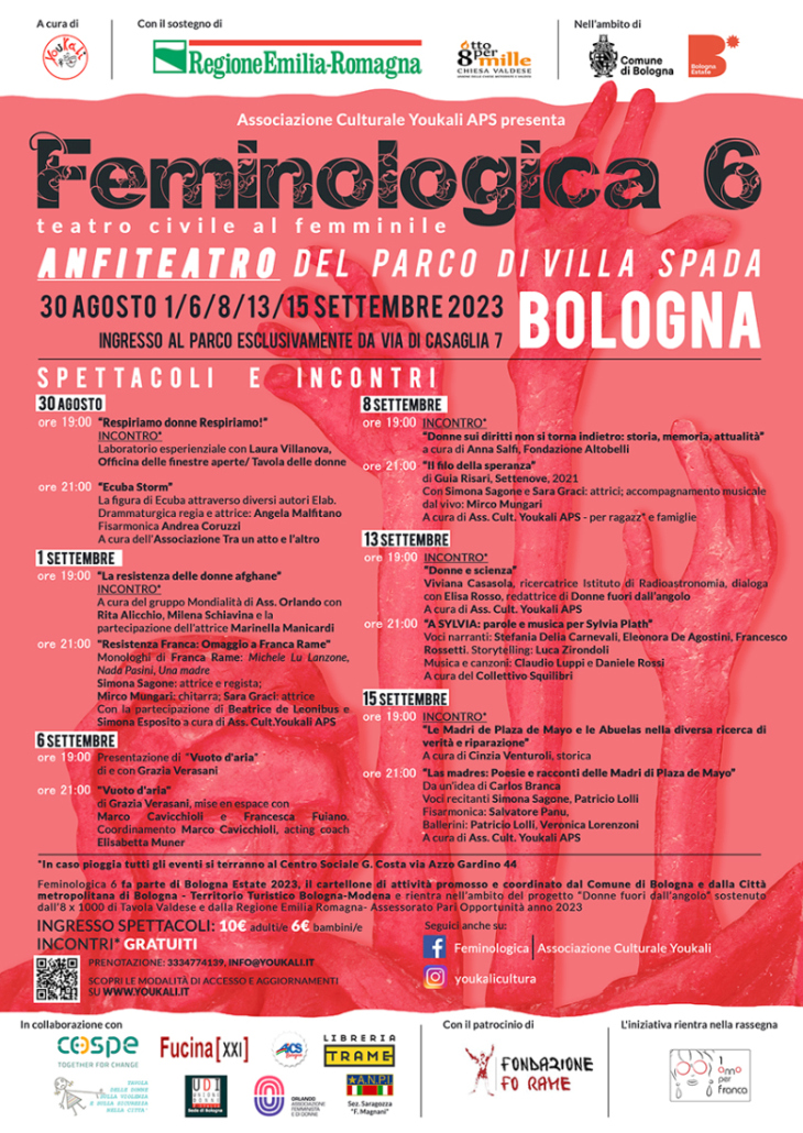 La rassegna Feminologica 6 - teatro civile al femminile è giunta alla sesta edizione, promossa e organizzata dall’Associazione Culturale Youkali APS e diretta da Simona Sagone. Dal 30 agosto al 15 settembre 2023, si tratta di sei serate di spettacoli e incontri per affrontare temi centrali per il nostro presente attraverso una lettura dei fatti e della società frutto di un'elaborazione femminile o riscoprire classici interpretati da artiste del territorio.